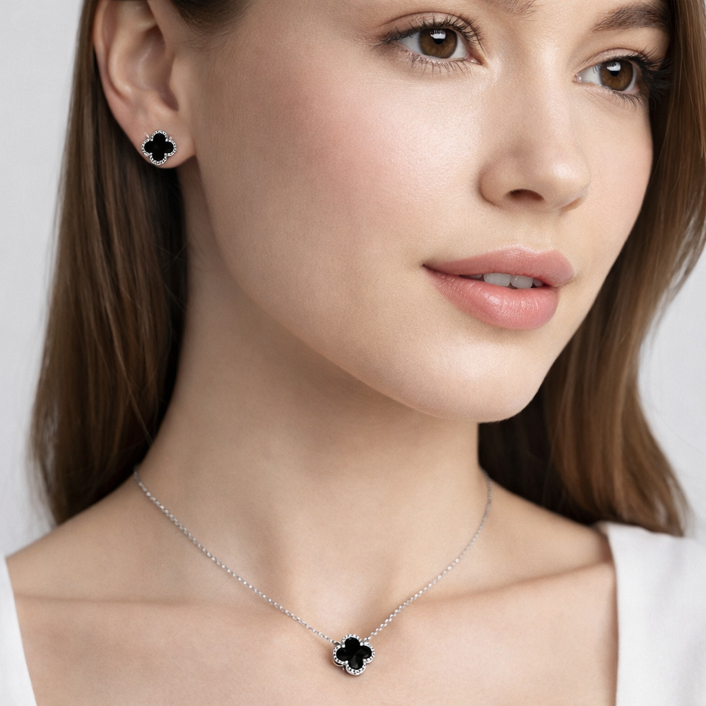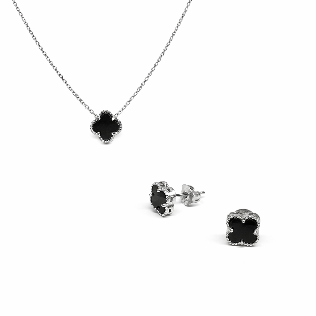 Komplet sa crnom detelinom – elegantan i moderan, sa simbolom sreće koji daje poseban akcenat. Jednostavan za kombinovanje, idealan za svakodnevne prilike.